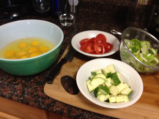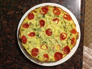 This frittata was a great alternative to our usual scrambled eggs and bacon. I cut it just like a pizza into eight slices and we each took a slice for breakfast Monday morning through Thursday last week. The leek really did act like onion–but it wasn’t sharp or bitter. The frittata had a nice, savory onion flavor complimented by the salty bacon and sweet tomato. I’ll admit, the zucchini flavor wasn’t much to speak of, but it did add good texture. 🙂 Breakfast success!