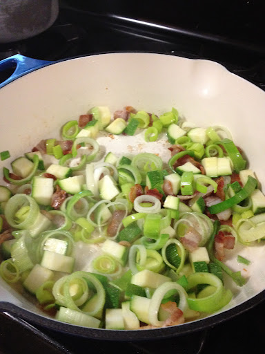- Cook the bacon, zucchini and leeks together until the leeks are soft, stirring occasionally (about 3 – 5 minutes).