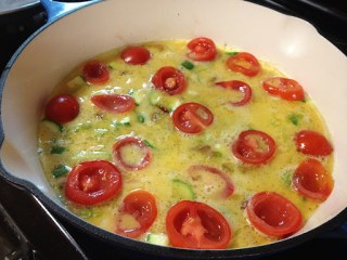 - Next, carefully place the tomatoes on top. They will sink into the egg, but since will have cooked a little, they should stay near the top.