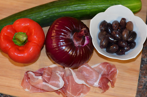 - Chop the baby spinach, red bell pepper, ham and shallot.