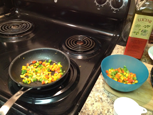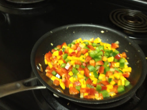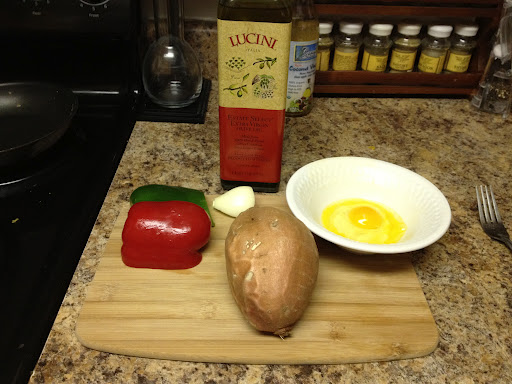 I grabbed a sweet potato, some leftover bell peppers and onion, the egg and some olive oil.