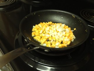 Step 1: Heat the olive oil over medium-high, then toss in sweet potato and onion. Sauté until the sweet potatoes are just a little soft (about 3-5 minutes, I think; I actually walked away to put on laundry and then tasted one little piece of sweet potato).