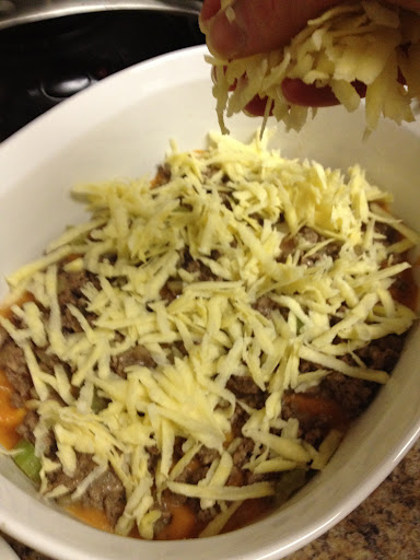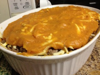 Once all the parts were ready, we began the layering process. Sauce, ground beef mix, shredded white sweet potato, repeat.