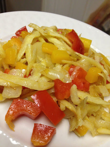4. Add the red bell pepper and continue sautéing and stirring for another 2-3 minutes or until the sweet potato is cooked through (it should change color from bright, starchy white to a dull ivory, almost like onion just before turning translucent).